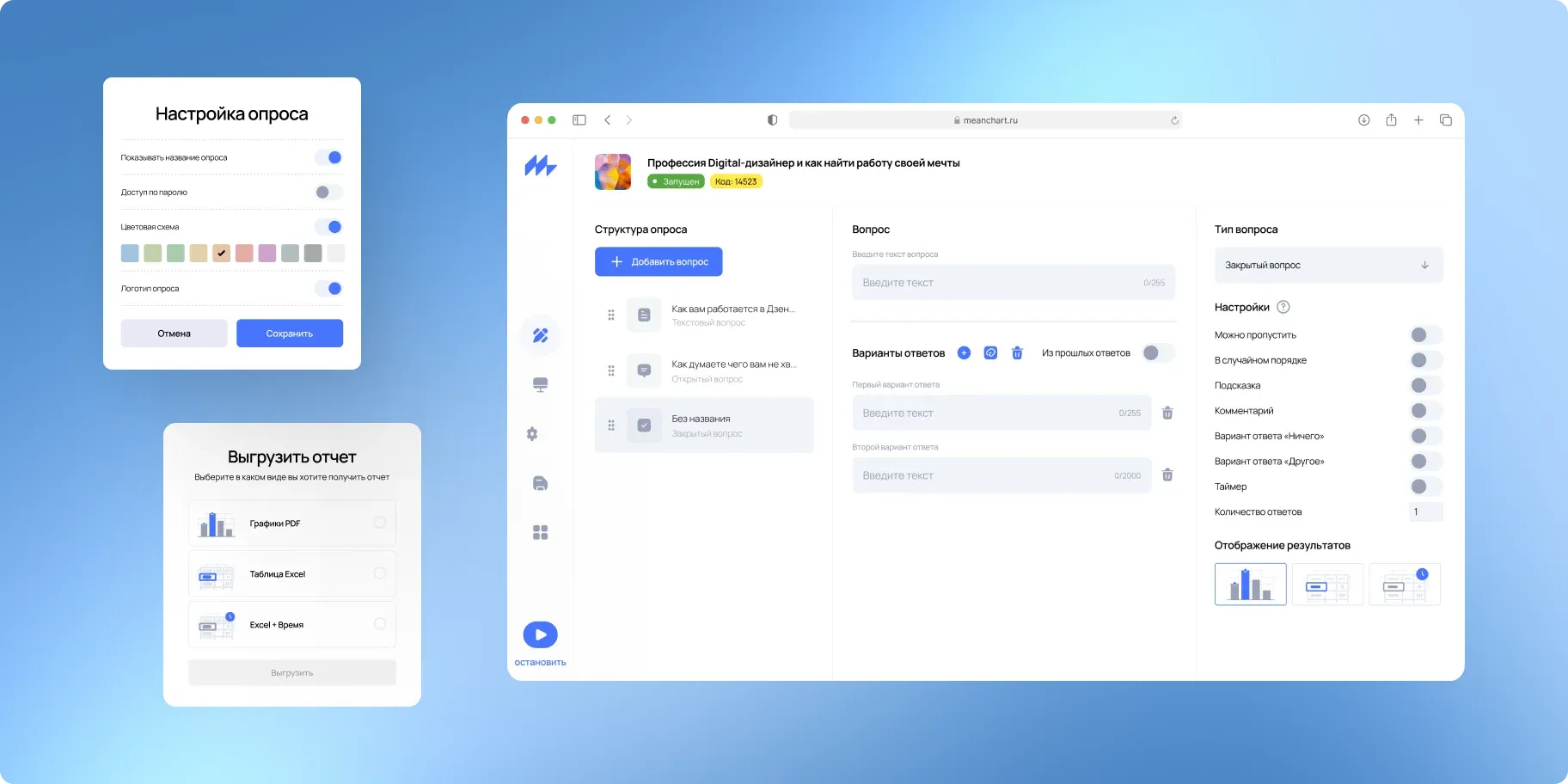 - сотрудникам самостоятельно создавать опросы с кастомными вопросами и анкетами;