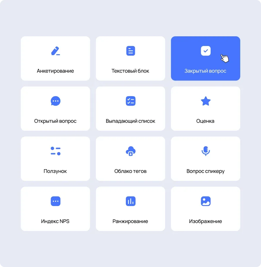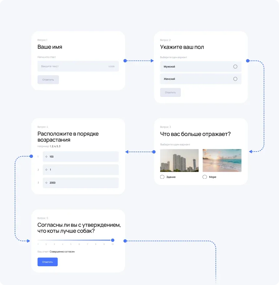- использовать разные типы вопросов (текст, выбор, чекбоксы, ранжирование и др.);